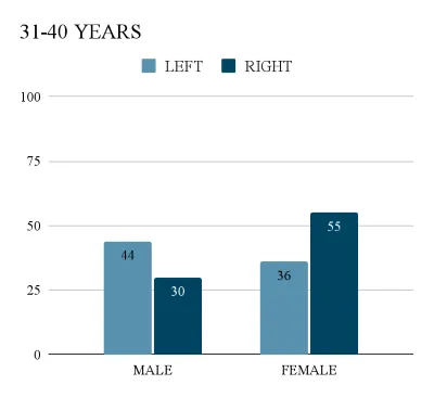 In the age group of 21–30, our research findings indicate a slight but discernible pattern regarding brain hemisphere orientation among males and females. Males tend to exhibit a higher inclination towards left hemisphere dominance, associated with logical reasoning. On the other hand, females display a tendency towards right hemisphere dominance, linked to creativity and intuition. However, it is important to note that the difference observed between the genders is not substantial, suggesting a balanced orientation overall.