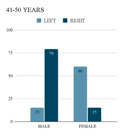 Within the age group of 31–40, our research corroborates the previously observed trends regarding brain hemisphere orientation among males and females. Notably, we observe a noticeable amplification of the pattern observed in the 21–30 age group. Males exhibit a more pronounced left hemisphere orientation. Conversely, females showcase a stronger inclination towards right hemisphere dominance. These findings suggest a potential developmental progression or societal influence as individuals mature into their 30s and 40s. While individual variations persist, this age group demonstrates a clearer distinction in brain hemisphere preferences between genders, highlighting the intricate interplay between the various influences in shaping cognitive profiles.
