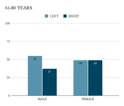 Within the age group of 61–80 years, our research findings reveal a distinct pattern regarding brain hemisphere inclination among males and females. Notably, males in this age group exhibit a stronger left hemisphere dominance, highlighting their heightened utilization of logical and analytical skills. In contrast, females showcase a striking balance in their hemispherical orientation, indicating a more equal distribution between left and right hemisphere dominance. These results suggest a potential mellowing down or convergence of cognitive profiles as individuals progress into the later stages of life. The observed gender-specific differences may be influenced by a combination of factors, including biological changes, lifelong experiences, and the cumulative effects of societal and cultural influences. Moreover, psychological factors such as life experiences, personal growth, and adaptability could contribute to the observed balance in hemispherical orientation among older females. The aging process often involves the acquisition of wisdom and a more holistic approach to problem-solving, drawing upon both logical reasoning and creative, intuitive processes.