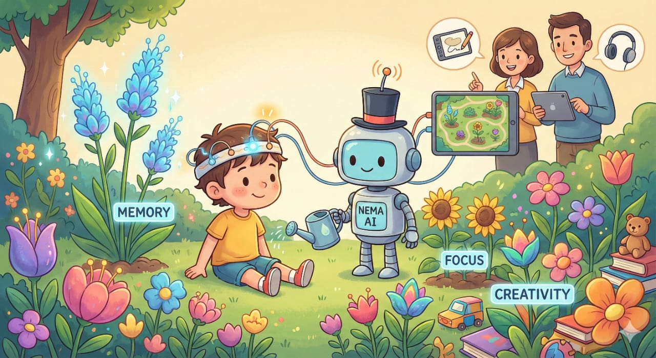 Now, NEMA AI is like your friend, a robot gardener who has a magic hat that can listen to your brain! When you wear this small headband (called an EEG), it can see which flowers in your brain-garden are strong and which ones need more attention and care.